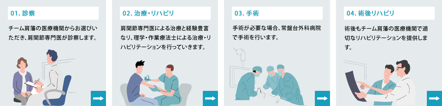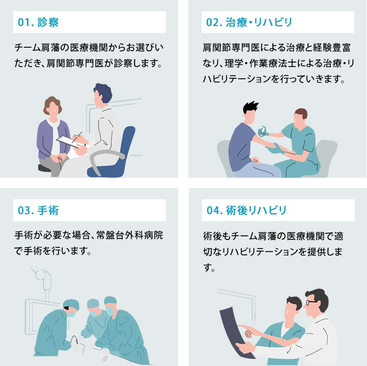 肩藩は、肩関節の治療において豊富な経験と高度な技術を持つ専門医(医院)と密接な連携を図ることで、患者さまにとって最善の治療環境を整えています。